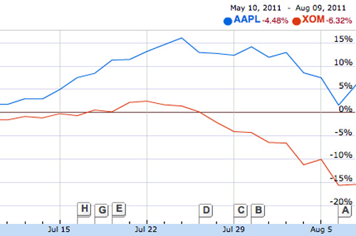 苹果公司虽然在昨天也受到了重创,但比埃克森要好很多。今天埃克森的股票价格持续走低,而苹果股价已开始反弹。