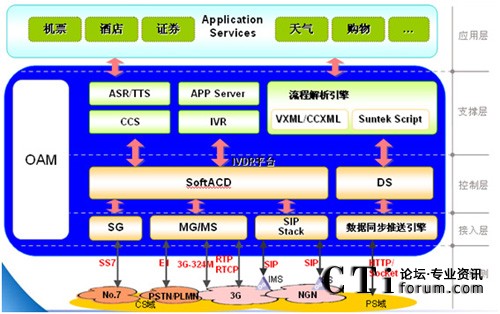 流程解析引擎支持VXML及SUNTEK Script流程语言,通过SCE集成开发环境,可以方便地定制开发动态语音流程。除实现IVR功能外,还可以通过数据链路同步向用户的终端推送数据,并通过终端软件的解析后展现在客户面前。