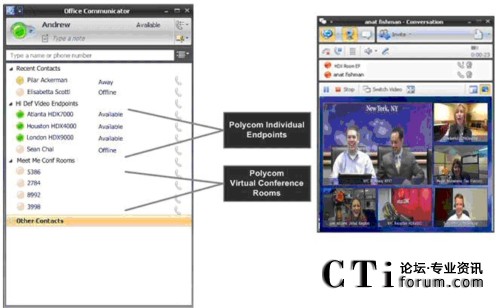 RMX 虚拟会议室出现在 Office Communicator 2007 联系人列表上,用户点击即可加入多点通话。这样, 商业用户就可以在 PC 和高品质视频终端上轻松开展协作,并保持与各方随时沟通。