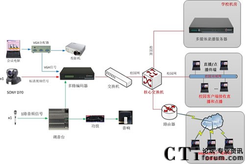 在后山第2教室里安装一台标清摄像头、一台多路编码器。标清摄像头主要用来记录老师讲课的视频,摄像机的视频信号通过视频线传输到控制室的多路编码器上,通过遥控器可以远端控制摄像头。同时老师的电脑通过一个VGA分配器将VGA信号一路传输给投影机,另外一路通过VGA线传输给多路编码器。录播服务器放置在学校机房,通过网络来连接不同的编码器来对整个课程进行实时录制、直播和点播。