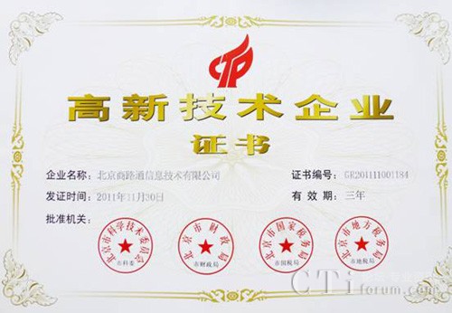 CTI论坛(ctiforum)3月23日消息(记者 浩宇):商路通再传喜讯,2012年3月12日商路通获得了“国家级高新技术企业”证书,(证书编号:GR201111001184,有效期三年),这标志着商路通发展的又一个新的里程碑。
