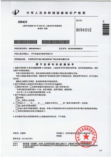 CTI论坛(ctiforum)4月24日消息(记者 欧阳): 近日,从中国国家知识产权局传来好消息,华平股份又一次获得发明新专利,该专利的名称为:互联网应用中减少服务器和客户端业务通讯量的方法。截止到2012年4月20日,华平股份共申请了发明专利46项,获得授权的发明专利20项。