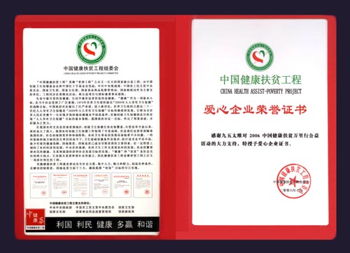 2006年7月,中国健康扶贫工作组委会向九五太维颁发了“爱心企业荣誉证书”,以此表彰九五太维对“2006中国健康扶贫万里行公益活动”的大力支持。