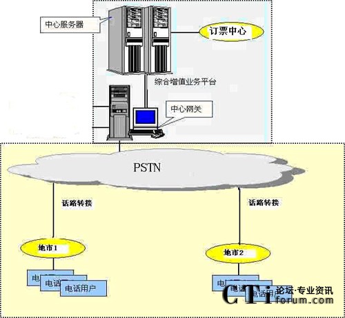 上图为省级铁路电话订票系统网络拓扑结构示意图。图中每个地市均建有语音客户服务中心,中心通过N × E1个线路与电话网连接。各地市语音服务中心通过DDN与省语音中心服务器相连。省语音中心服务器通过网关连接到银行,与省订票中心可通过DDN专线、电话或采用报盘方式进行信息交互。该系统的伸缩性能很好,对于独立的地市级铁路电话订票系统,可直接把中心服务器下移到地市一级即可(此时可省去中心网关)。