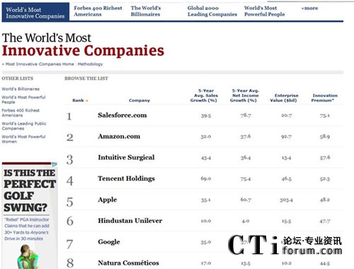 CTI论坛(ctiforum)8月15日消息(记者 张洁):2011年7月,由美国知名财经杂志《福布斯》评选出的全球百大最具创新能力企业排行榜上,salesforce.com超越Facebook、苹果、亚马逊等知名企业位列第一。
