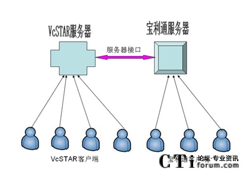 VcSTAR服务程序与宝利通系统进行平台对接,各系统客户端联接各自服务器系统,声音、图像、文本等多媒体通过服务器间的接口互通。