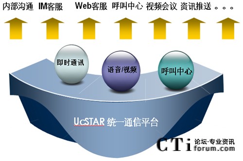 UcSTAR企业融合通信平台集成了丰富的沟通方式,包括文本会话、IP电话、语音/视频交流、传真、手机短信、文件传输、网络会议、文档/应用程序共享、电子白板、共享日历、EAMIL。同时它提供各种融合接口和功能,如组织结构数据同步、单点登陆、WebMail、消息发送等等。该平台定位于降低企业通信费用,增强企业内外部沟通能力,改善企业与客户之间的沟通渠道,创造新兴的企业沟通文化,提高企业生产力。