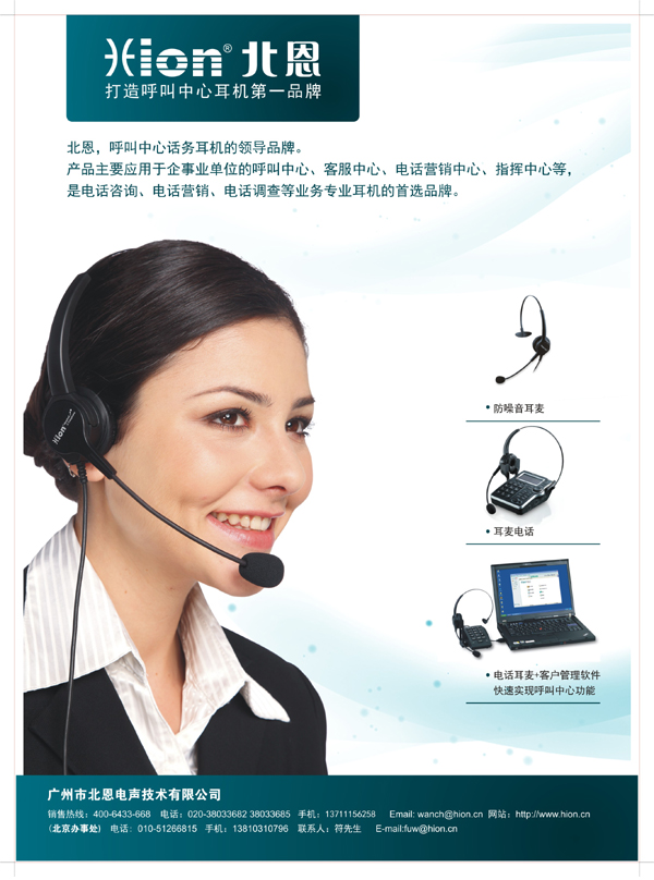 目前北恩Hion耳机品牌已覆盖全球市场,在北京、上海、广州、深圳、郑州、南京设有售后服务中心,并在北美、欧洲、南亚等拥有核心合作伙伴。产品主要应用于电信、金融、电视购物、物流等客服中心以及总机接线员、指挥中心、呼叫中心等,是电话咨询、电话营销、电话调查等业务专业耳机首选产品。北恩采用最先进耳机生产技术,制造世界一流的通信耳机,全力打造呼叫中心话务耳机第一品牌。