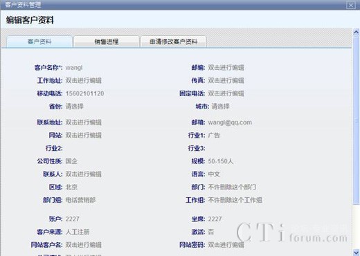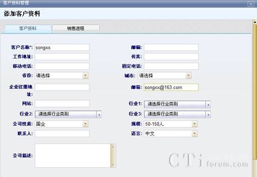 对新添加的客户录入客户信息资料,包括客户的名称、邮箱等,为其建立起一个新的客户关系,可以随时找到该客户的具体信息以及他的销售情况,方便对客户销售进程有一个充分地实时跟踪,并为之更好地服务。