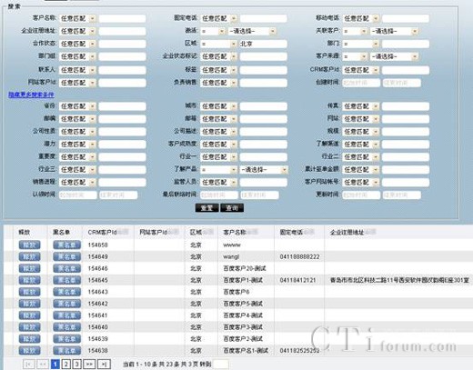 例如,以区域为条件进行搜索,区域选择北京后,点击查询,你想要的北京区域的客户全部出现在客户列表中。