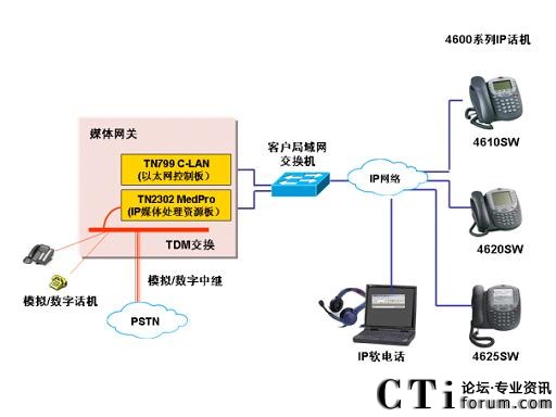 IP终端通过企业的数据网络平台进行部署,媒体网关上配置相应的IP板卡为IP电话终端提供登录、注册和语音处理,如下图所示: