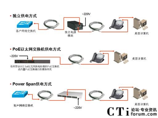 IP电话相对于原有模拟分机或数字分机采用以太网端口连接,其供电方式也相应随之改变,46xx系列IP硬件话机支持以下3种供电方式: