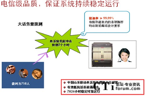 华为联络中心系统具有高稳定性、高可靠性、易扩展性和可维护性。这主要源于华为对电信网络现状与演进的理解,源于华为拥有固定、移动和IP三个网络方面综合实力。华为数以千计的核心平台开发测试人员,几十种极端环境(如超大话务量、温差、湿度、盐碱度、缺氧等),磨砺出的是世界级的高品质。麦加朝圣10KM内密集200万移动用户,大部分为国际漫游,整齐划一的用户行为,形成连日多波话务尖峰,网络受不均衡冲击,系统容易雪崩。使用华为方案STC连续四年征服HAJJ期间话务高峰,告别系统每逢朝圣就瘫痪历史。正是继承了这样的DNA,我们在某移动运营商联络中心系统单点实测BHCC1200K,每天平均呼叫量为600万次,一套系统支撑着2000多座席和近8000路IVR。