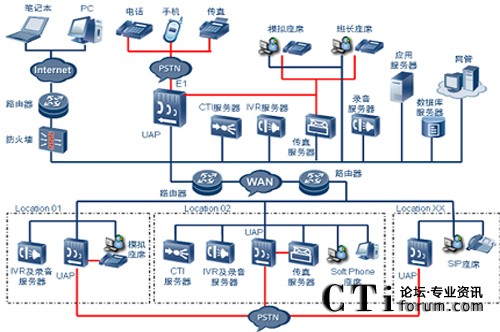 华为多媒体联络中心提供完善的分布式组网及集中式组网功能,可以提供分布式接入、分布式IVR、分布式录音系统、分布式坐席、分布式传真系统及网络呼叫中心技术。如果各个分支机构有较多本地化业务需求的时候,各个分支机构只需要再配置一台CTI服务器,就可以升级成完整的联络中心系统,可以单独开展丰富的个性化业务。如果总部再安装一套网络呼叫中心,则可以实现联络中心的互连,即网络呼叫中心。