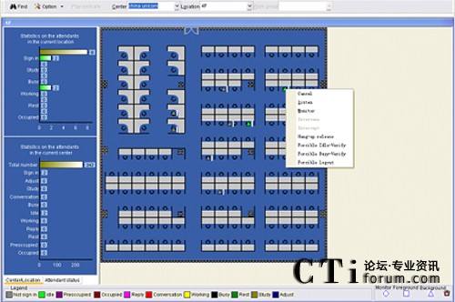 系统提供一整套管理工具,辅以图形化的人性设计,将复杂的设备维护和系统优化简化为简单的图形管理,降低了维护难度和对维护人员的要求,提高了维护效率,使联络中心更为稳定可靠地运行。座席地图按真实座席位置展现座席状态,使业务代表服务质量的监控和检查更为形象高效,有利于提升业务代表服务质量。