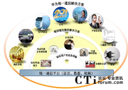 华为企业统一通信解决方案把语音、数据、视频融合在统一的平台上,基于该平台可以方便实现IP语音系统、语音/数据会议系统、统一消息、话务台、无线WIFI、安全、自助管理等多业务多系统的融合和协作。
