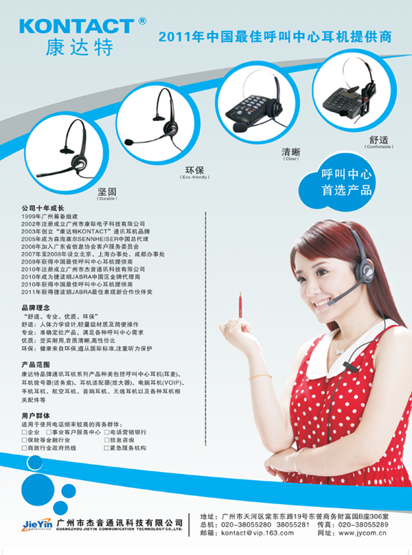 康达特通讯耳机产品主要应用于企业和政府的客户服务中心、电话营销中心、商务中心、紧急指挥中心、酒店总机等办公场所,对于长期从事电话营销、电话咨询、商务调查等工作人员,是一件必不可少的通讯工具。
