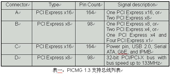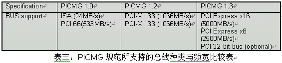 表三是PICMG 1.0到PICMG 1.3,所支持的总线种类与频宽列表。表中可以看出每次的规格更新,频宽均提升了一倍以上。