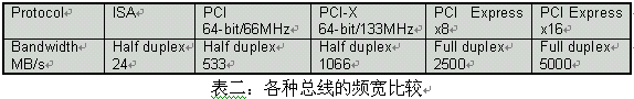 从第一个工业计算机规范PICMG 1.0发布至今,总线从ISA演进到PCI、PCI-X,一直到现在的PCI Express,每一次的更新,目的就是为了提升系统I/O的频宽,表二是上述各种总线的频宽比较表。