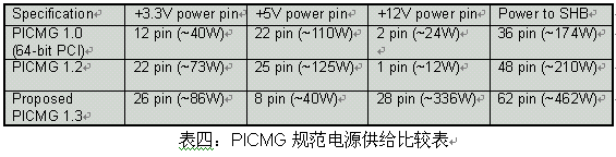 为了支持新一代的CPU与内存,在电源供给上,PICMG 1.3增加了更多的power pin,表四是PICMG 1.0到PICMG 1.3的电源供给比较表。