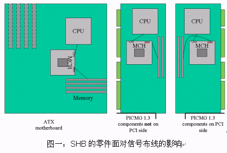 Express卡相反,这一点与PICMG 1.2不同,这样的转变主要源于二个考虑,一是为了使CPU、北桥、与内存接口之间的高速信号线在PCB布线时,走线更为顺畅。如图一所示,如果零件面与PCI