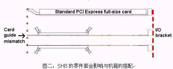 Express卡相同,CPU与内存接口之间的信号线将互相缠绕而不利走线;二是机箱的设计不用更改。如图二所示,CPU板卡的零件面与PCI Express卡相反时,板卡的边缘刚好对准沟槽的导轨。