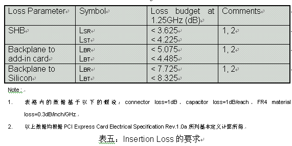 图三是信号的连接方式示意图,图中可看出SHB在分析insertion loss时,是把PCI Express connector视为阻抗的一个不连续点。表五则是信号在insertion