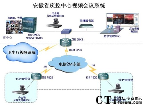 视频系统采用1台MCU ZXMVC 8900和18套T502分体式视频终端,以H.323框架下2Mbps带宽、H.264协议下4CIF图像格式组网。承载网络:省中心配置一台ZSR 2842路由器,采用155M CPOS同运营商网络连接,用于汇聚分会场的2M专线;每个地市疾控配置一台ZSR 1822路由器,采用2M 75欧E1接入运营商网络。系统覆盖位于合肥市的省疾控中心,和17个地市的疾控中心,承担安徽省疾控系统内部的会议、培训等工作,并同安徽省卫生厅的视频会议系统互连召开全省卫生系统会议。