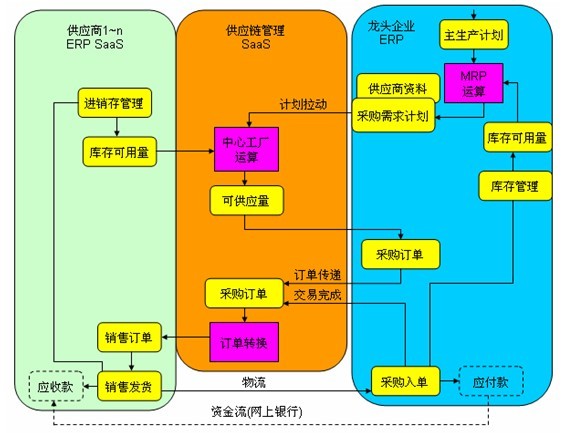 在线需求计划管理。当龙头完成企业内部的MRP运算后,便输出“采购需求计划”;该计划作为供应链管理平台,中心工厂(或称虚拟企业)运算的输入,此刻供应链管理平台可以动态地挖掘供应商的(ERP)的“库存可用量”,并计算出“可供应量”,该数据可提供给龙头企业编制“采购订单”。