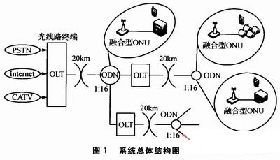 系统的总体结构如图1所示。它与传统的EPON系统的主要区别在于本系统在普通ONU中融合了Wi—Fi无线组网方式,同时为终端用户提供有线和无线两种方式的服务。这里将本系统命名为融合型ONU。