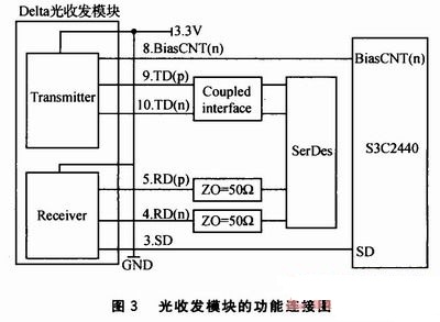光收发模块的功能连接图如图3所示。其中3.SD是光收发模块的第3个引脚,它的功能可以描述为有光输入时为逻辑高,否则为逻辑低;4.RD(n)是第4个引脚,反向接收数据的输出;5.RD(p)是第5个引脚,正向接收数据的输出;8.BiasCNT(n)是第8个引脚,控制ONU突发模式操作的负脉冲;9.TD(p)是第9个引脚,正向发送数据的输入;10.TD(n)是第10个引脚,反向发送数据的输入。