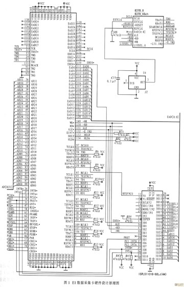 随着电信网络迅速发展,基于软交换技术的NGN网络应运而生。在构建中,NGN需通过信令网关SG与现有的七号信令网互通,但在物理上采用HDLC格式的 E1传输。为了维护NGN网络,实现不同采集口的多协议关联、呼叫的合成等功能,相应的测试仪表必须提供网卡和E1卡的测试接口。根据NGN网络测试仪表的总体设计方案要求,数据采集卡采用PCI插槽,E1信号经物理接口器件成帧,通过串口送给MUSYCC,完成消息重组,最后通过PCI总线将消息送至上层软件进行协议分析处理。数据采集卡提供网络接口的物理层、链路层功能以及PCI规范接口,可同时监测8路E1信号。