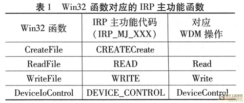 在Windows中,应用程序与WDM通信的实现过程:应用程序应先获得设备句柄GUID码,然后利用CreateFile函数打开设备,通过 DeviceIoControl函数传递控制代码参数和WDM进行通信,包括从WDM中读取数据和写数据给WDM两种情况,也可利用ReadFile从 WDM中读取数据或用WriteFile写数据给WDM:当下层驱动有触发事件时,就需要Event事件通知上层软件。当应用程序退出时,CloseHandle则关闭设备,这将产生对应于此设备对象的相应IRP消息。这种关系如表1所列。