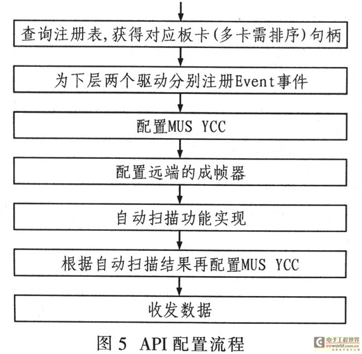 由于E1数据采集卡的MUSYCC控制器是PCI多功能设备,所以应用程序应当合理调整两个功能驱动程序的控制顺序,实现E1数据的正常采集。其E1卡应用程序(API)的配置流程如图5所示。