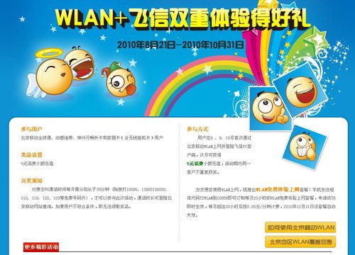 同时,用户在8 、9、10月首次通过北京移动WiFi上网并登陆飞信PC客户端,次月可获得5元话费小额充值,活动期内同一客户不重复获奖。
