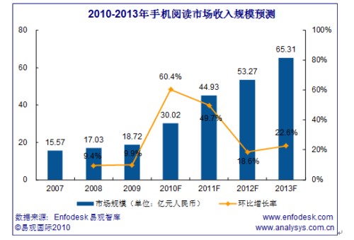 易观国际(Analysys International)分析预计2010年手机阅读市场规模将突破30亿元。