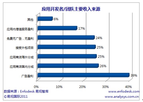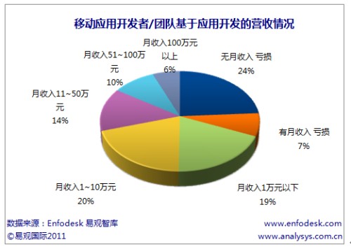 CTI论坛(ctiforum)3月11日消息(记者:张洁)新兴移动互联网终端的快速发展以及终端厂商“终端+应用商店”的商业模式带动了上游应用开发者的投入力度。据易观国际(Analysys International)最新报告《中国应用开发者/团队研究报告2011》研究发现,现阶段应用开发者主要开发免费应用,整体盈利不够明显。