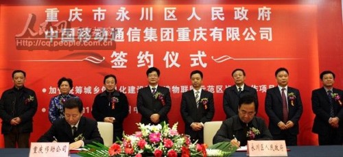 23日上午,中国移动通信集团重庆有限公司与永川区政府签约,预计五年内,重庆移动将在永川投入12亿元打造物联网示范区,用以统筹城乡信息化建设,并将重庆移动10086呼叫中心项目设在永川。到2015年,永川区将成为重庆移动在西部地区最大的呼叫中心。
