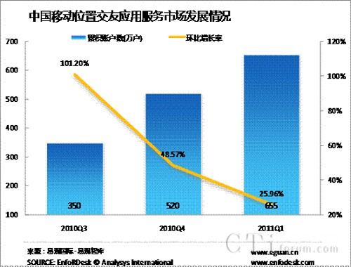 2011年Q1中国移动位置交友应用累计帐户数达655万