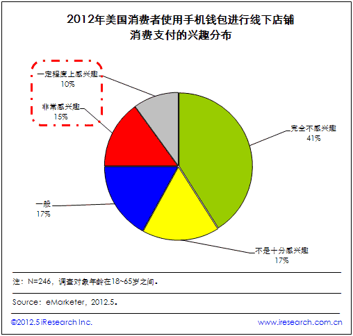 iResearch艾瑞咨询整理eMarketer调查数据发现,尽管手机支付市场增速迅猛,但其在美国消费者中的接受程度相对较低。数据显示,被调查者中只有1/4的美国用户对使用手机钱包在线下店铺消费感兴趣,而相比之下,58%的消费者对手机钱包技术不感兴趣,其中包括41%的人完全没兴趣。