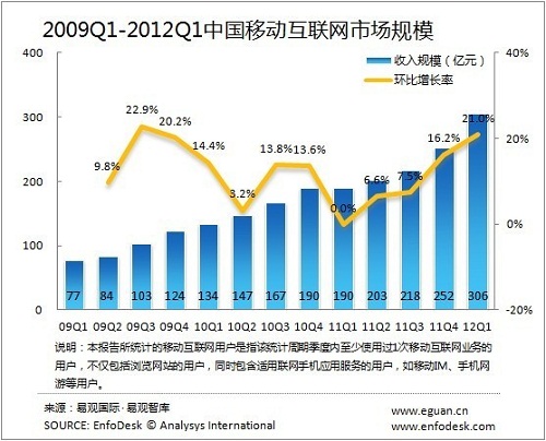 根据易观智库EnfoDesk产业数据库发布数据显示,截止到2012年第1季度,中国移动互联网用户规模已经达4.5亿,第1季度市场规模达到306亿。