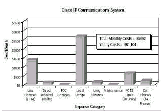 CallManager调整电话数量,因而可以取消大多数POTS线路。第三,两个PRI(主速率接口)的接入功能可以等同于175条线路,但成本要低得多。”