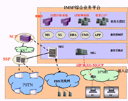 4、 支持标准的SIP/H.323协议,IMSP支持IP接入,系统可平滑过渡到下一代网络(NGN),逐步建立符合标准的服务、网络和终端,彻底取代原有相对独立的应用服务、通信网络和终端。;