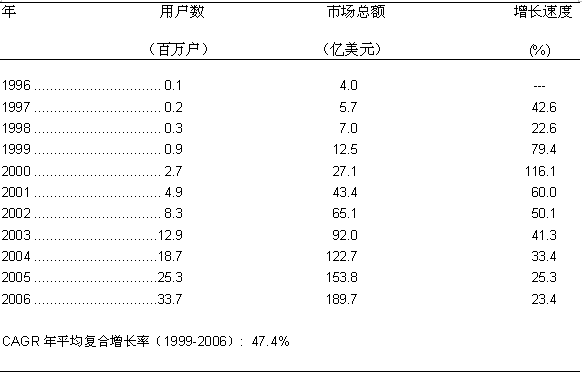 图一: 美国宽带接入服务市场的增长历史和预测 1996-2006