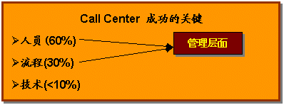 企业必须牢记在心,成功运营呼叫中心的三要素 人员、流程和技术,三项缺一不可,而更重要的是如何适当地整合这三项要素。鉴于以往经验,呼叫中心的成功与否,人的因素占60%,流程因素占30%,而技术因素只占10%。这并不表示可以忽视技术的重要性,技术一样很重要。如果没有当今日新月异的科技,企业便无法实现呼叫中心的运营;而成功地实现呼叫中心有效的管理与运营,关键在于管理能力,也就是对人员及流程的把握。