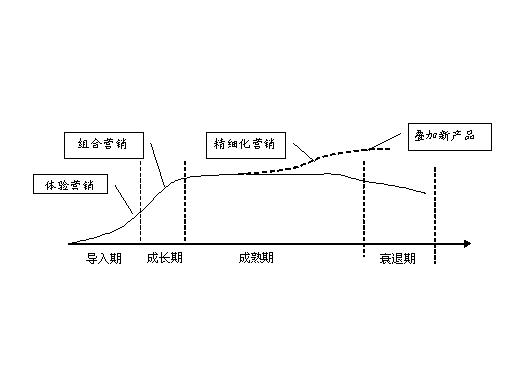 漏话业务是对现有基础电信业务的延伸和补充,是建立在基础通话服务基础上的功能型增值业务,在业务推广中,应根据业务的不同的发展阶段,分别在业务的导入期、成长期、发展期和衰退期采取不同的营销手段和措施,如下图所示。