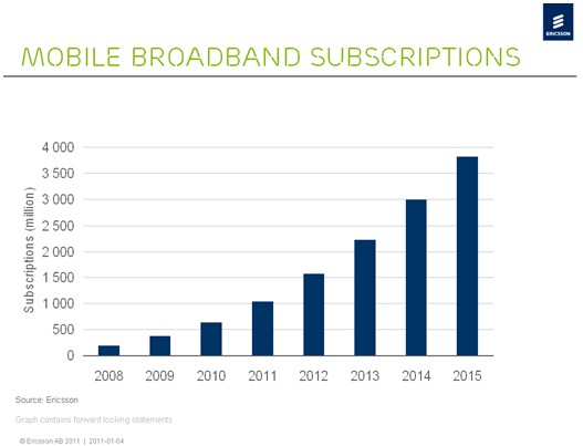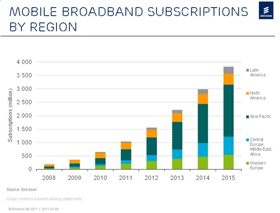 2010年见证了全球移动宽带用户数突破5亿的里程碑。而据爱立信(NASDAQ:ERIC)预测,这一数字将在2011年底前再翻一番。其中亚太地区将拥有最多用户,约4亿,紧随其后的是北美和西欧地区,各2亿。