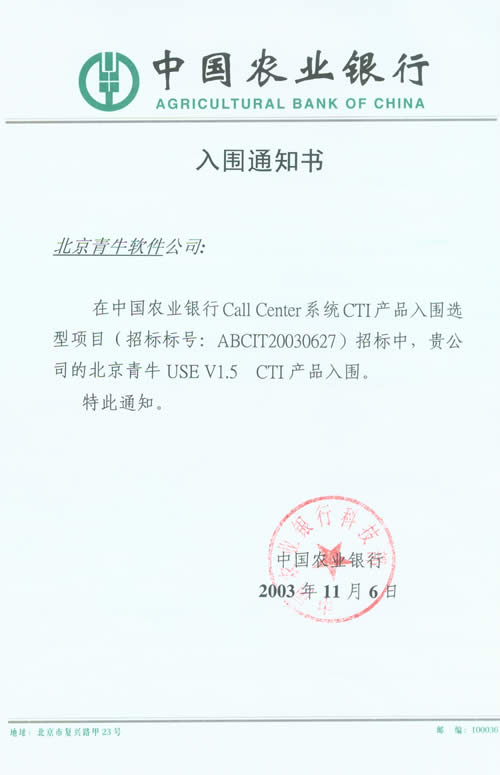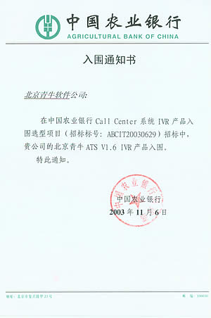 日前,中国农业银行进行的呼叫中心系统产品选型工作已阶段性圆满完成。在此次选型项目中,青牛软件作为唯一的两个产品同时中标的产品厂商成功入围中国农业银行Call Center系统产品选型项目。