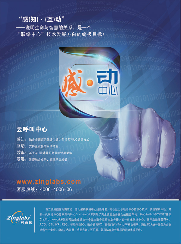 英立讯科技(Zinglabs)是国际领先的高效能一体化联络中心平台及CTI解决方案提供商。一直秉承“创新设计、追求卓越”的理念,为其用户和合作伙伴开创着一个无限丰富、灵活的平台空间。英立讯科技的产品会帮助企业建立一个完全融合的支持全媒体接入的一体化联络中心,为企业提供一个安全、可靠、大容量、功能完备、可扩展,并且与企业业务系统无缝集成的技术平台。公司专心致力于CTI领域,是专注于CTI技术并引领相关技术走向的联络中心平台专业化厂商,在一体化架构联络中心产品的完善和提高方面不断努力创新,为客户定制随需应变的联络中心平台。