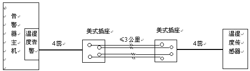 温、湿度传感器通过四蕊电话线与告警器主机相连。两者距离很近时,将传感器接线插入主机温、湿度告警接口即可。若距离不够长时,可按上图一对一的加长连线,连线距离可达3公里。